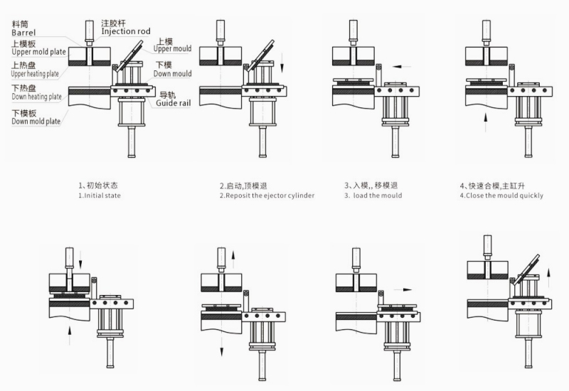 - 开合模行程由接近开关精确测量和控制,开合模多级速度调节;